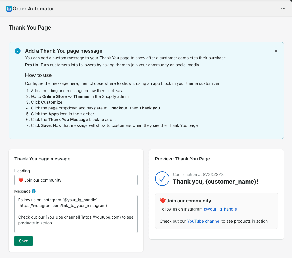Here's a 90 second video setup guide: Boost Engagement on Shopify with a Custom Thank You Page Message