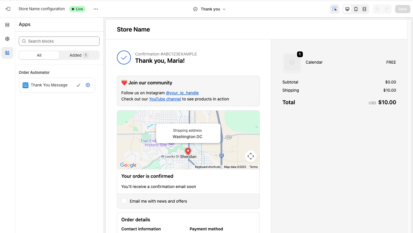 - Now you'll see the message from step 3 showing on your Thank You page. Click save to activate it so it shows to customers after they place a new order